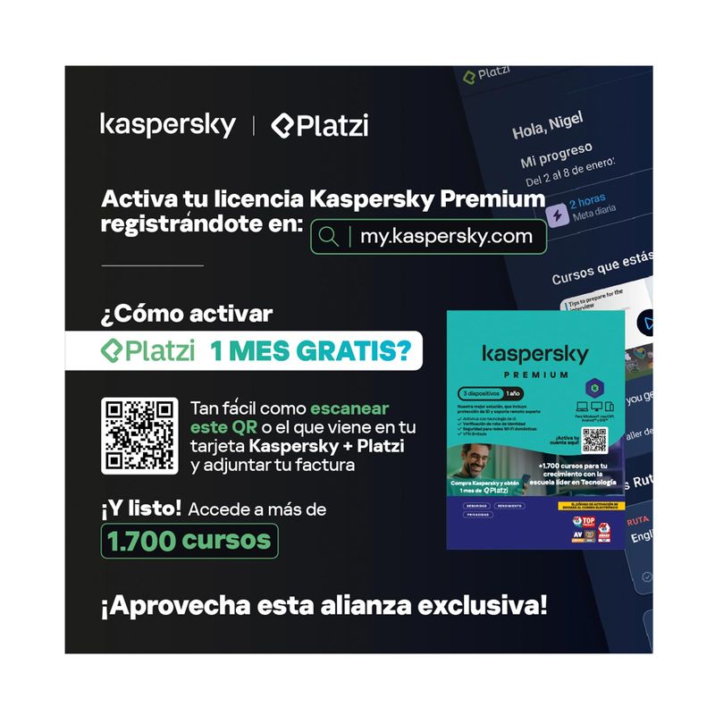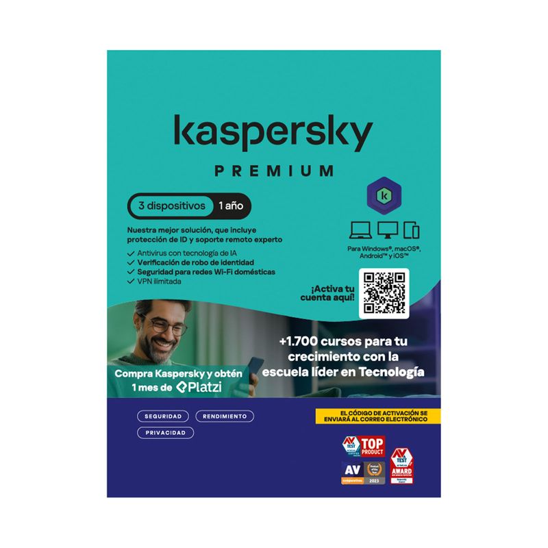 Protege hasta 3 dispositivos durante un año con la solución de seguridad más completa de Kaspersky (PC, Mac, Android o iOS). Incluye antivirus avanzado, protección en tiempo real contra malware y ransomware, navegación segura, control de privacidad, VPN integrada y herramientas de optimización. Ideal para mantener tu PC, smartphone o tablet seguros y funcionando al máximo rendimiento.