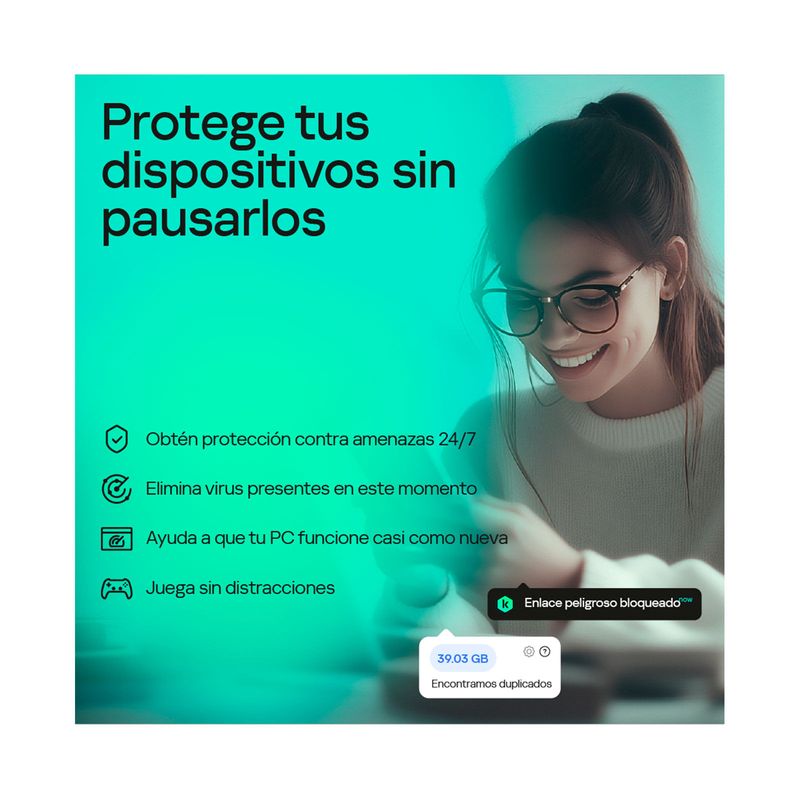 • Antivirus avanzado en tiempo real: detecta y bloquea amenazas nuevas y existentes antes de que dañen tus dispositivos.