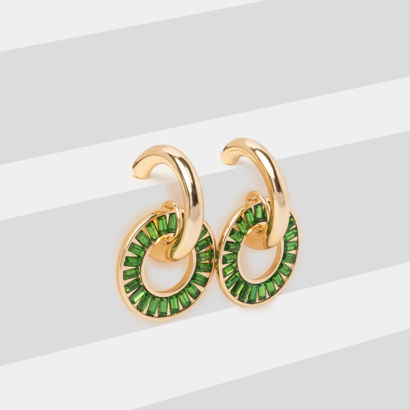 Aretes dorados diseño semiaro con circulo y rectángulos verdes