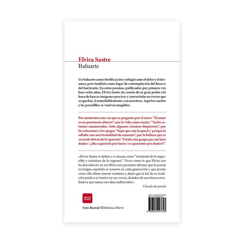 Un baluarte como fortificación y refugio ante el dolor y el desamor, pero también como lugar de contemplación del deseo y del horizonte. En estos poemas, publicados por primera vez hace ocho años, Elvira Sastre da cuenta de su gran poder a la hora de buscar imágenes precisas y convertirlas en versos que se quedan, irremediablemente, con nosotros. Aquí los sueños y las pesadillas se vuelven tangibles.