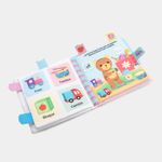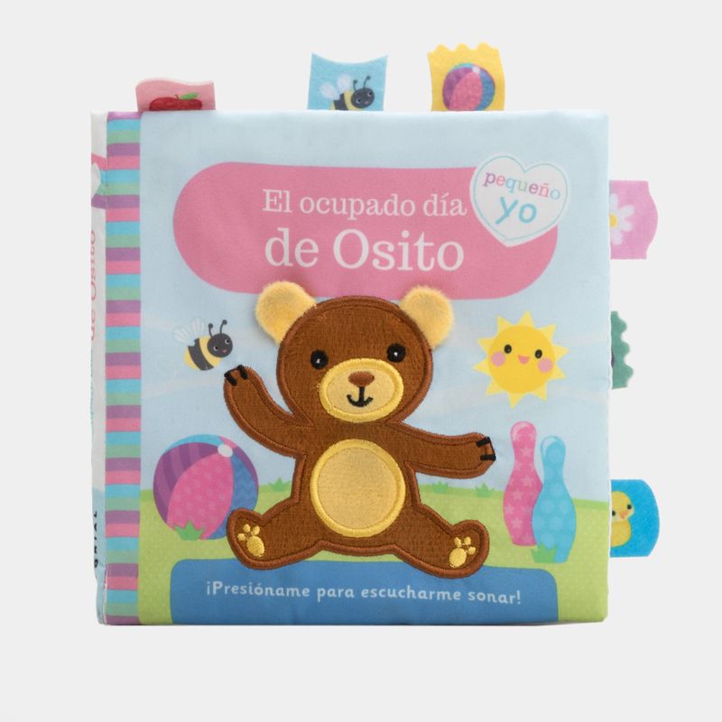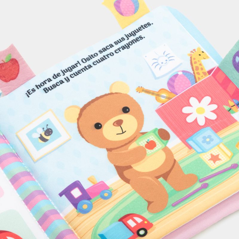 Acompaña a osito en un día lleno de diversión con este libro interactivo de tela, que incluye palabras básicas para aprender en cada página. Tiene una portada táctil con un botón sonoro para impresionar, además de paginas que emiten sonidos y pestañas de fieltro suave.
