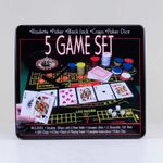 Juego ruleta mini 5 en 1: Ruleta-Póker-BlackJack-Craps-Dados de póker Incluye: -Ruleta con dos esferas de acero -Palo de crupier -2 tapetes de fieltro reversibles -100 fichas -4 Dados -Baraja de naipes -Dados de póker