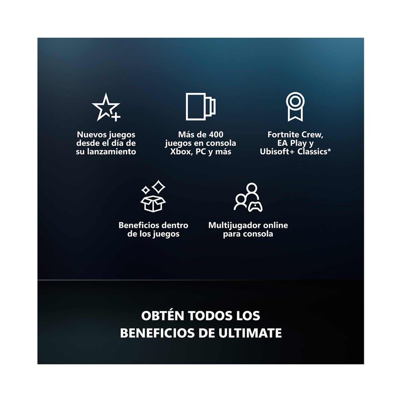 Accede a más de 400 juegos en Xbox, PC y móviles, incluyendo estrenos desde el primer día como Black Ops 7 y Silksong. El servicio integra las bibliotecas de EA Play, Ubisoft+ Classics y beneficios de Fortnite Crew (V-Bucks y Battle Pass). Además, incluye multijugador online, recompensas exclusivas en títulos populares y descuentos para socios.
