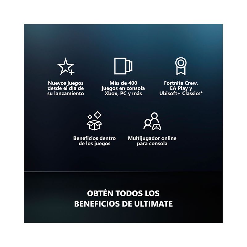 Accede a más de 400 juegos en Xbox, PC y móviles, incluyendo estrenos desde el primer día como Black Ops 7 y Silksong. El servicio integra las bibliotecas de EA Play, Ubisoft+ Classics y beneficios de Fortnite Crew (V-Bucks y Battle Pass). Además, incluye multijugador online, recompensas exclusivas en títulos populares y descuentos para socios. BENEFICIOS • Descarga y juega juegos en la consola Xbox, en PC y en dispositivos portátiles compatibles. • Únete a tus amigos para jugar, chatear y explorar juntos con el modo multijugador online para consola. • Gana beneficios dentro de los juegos más grandes, como League of Legends, Call of Duty: Warzone, y Rainbow Six Siege. Sumérgete en los títulos más populares como EA Sports FC, Los Sims, Star Wars™ y otros favoritos de los fans con EA Play. Descubre más de 50 juegos icónicos de algunas de las franquicias más memorables de la historia de los juegos con Ubisoft+ Classics. Obtén acceso al Fortnite Battle Pass, 1000 V-Bucks cada mes y más con Fortnite Crew. • Encuentra tu comunidad con Xbox y juega donde quieras. • Nuevos juegos desde el mismo día de su lanzamiento, incluidos los nuevos juegos publicados por Xbox y los juegos de terceros. • Clasificación: todos (hasta adultos). REDENCIÓN Importante: la configuración de país o región de tu cuenta debe coincidir con el lugar donde se compró el PIN. EN EL SITIO WEB Puedes redimir todo tipo de códigos por medio del sitio web. 1. Entra a redimir tu pin (https://redeem.microsoft.com/) e ingresa a la cuenta con la que quieres redimir tu código. 2. Ingresa el PIN o el código que aparece en el recibo, en tu correo electrónico o SMS. 3. Haz clic en Canjear y listo. EN WINDOWS XBOX APP Es importante verificar que accedió a la app desde la cuenta con la cual quiere redimir su código. 1. Desde la primera pantalla encontrarás a la izquierda el ícono de tienda. 2. En esa pantalla encontrarás el botón para redimir. 3. Ingresa el PIN o el código que aparece en el recibo, en tu correo electrónico o SMS. 4. Haz clic en Canjear y listo. AVISO LEGAL Todas las suscripciones a Xbox de la siguiente lista con viñetas requieren la aceptación del contrato de servicios de Microsoft (microsoft.com/msa) y de los términos y condiciones aplicables a continuación. Las suscripciones que no se enumeran a continuación están sujetas a las condiciones de venta de la Microsoft Store (microsoft.com/es-co/storedocs/terms-of-sale) y a las condiciones específicas de la suscripción. Podemos actualizar estas condiciones en cualquier momento. Cuando publiquemos cambios en estas condiciones, modificaremos la fecha de "última actualización". Para mayor información ingresa a: https://www.xbox.com/es-CO/legal/subscription-terms.