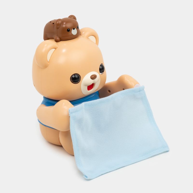 • Al encender el proyector, el oso sube sus brazos y se tapa la cara con la manta